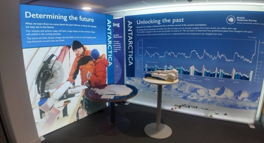 Next, we boarded a fully electric bus and travelled to the British Arctic Survey (BAS). We had an interactive discussion around the importance of climate change and how scientists in the Arctic learn more about the planet through exploring the nature of ice. The deeper the machines drill, the more humanity can learn about temperature change, carbon and atmosphere shifts over time.